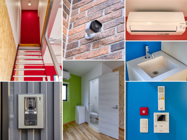 セキュリティ完備、リモコン式シャッター、インターネット、流し台、トイレ、電気代無料(50kwまで)、フリーボード(自由にDIYが楽しめる)など。