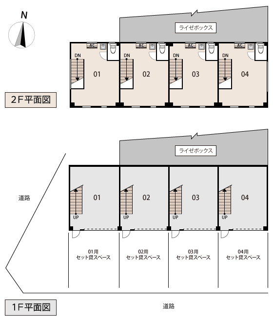 | No. | 1F | 2F | 広さ(合計) | 備考 | 月額利用料 | ||||||||||
