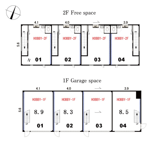 | No. | 1F | 2F | 広さ(合計) | 備考 | 月額利用料 | ||||||||||